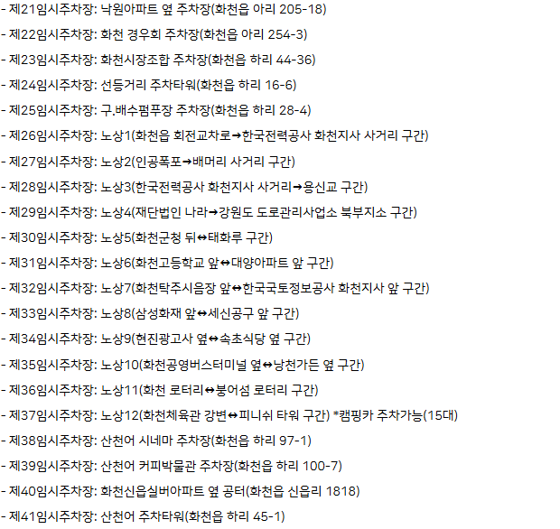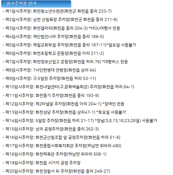 - 화천 산천어 축제에서는 임시 주차장을 운영하고 있으니 아래에서 가능한 임시 주차장을 찾으시기 바랍니다.
