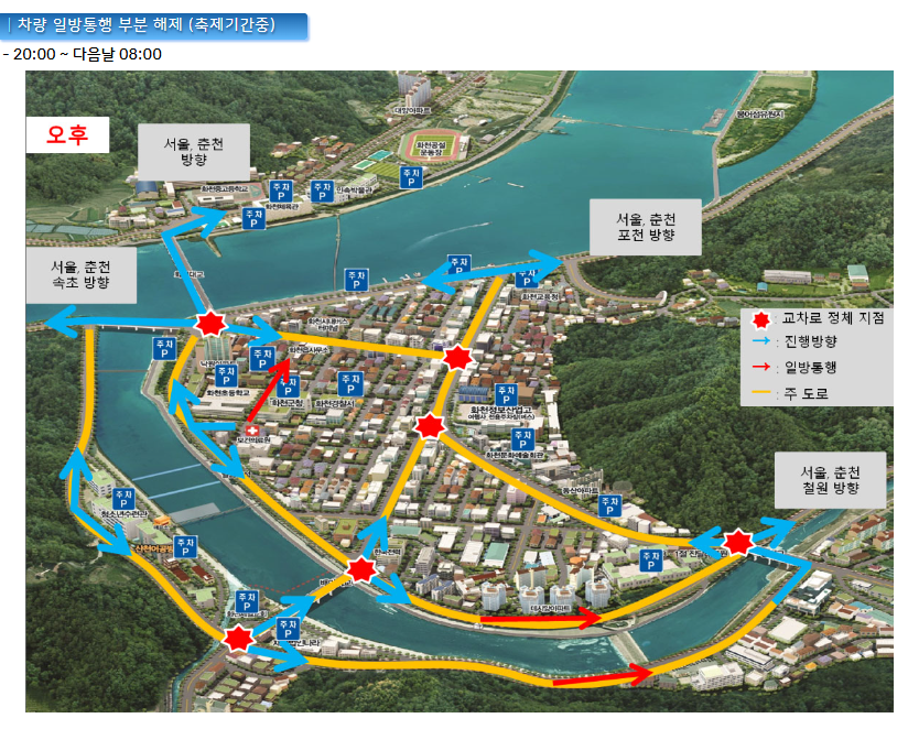 축제기간 중에는 차량 혼잡을 방지하기 위해 일방통행이 시행됩니다. 아래 지도를 숙지하시어 주차장 위치와 지정된 운행 경로를 미리 확인하시고 안전하게 이동하시기 바랍니다.
